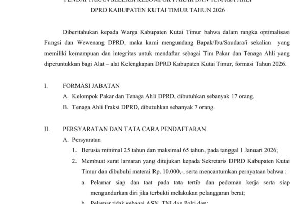 SANGATTA — Sekretariat DPRD Kutai Timur resmi menuntaskan proses seleksi dan tes wawancara bagi calon tim pakar dan tenaga ahli DPRD Kutim Tahun 2026. Seleksi yang berlangsung selama tiga hari diruang Panel Gedung DPRD 13–15 Januari 2026, diikuti oleh 40 peserta, dengan kuota penerimaan sebanyak 25 orang yang akan mendukung tiga fungsi utama DPRD, yakni…