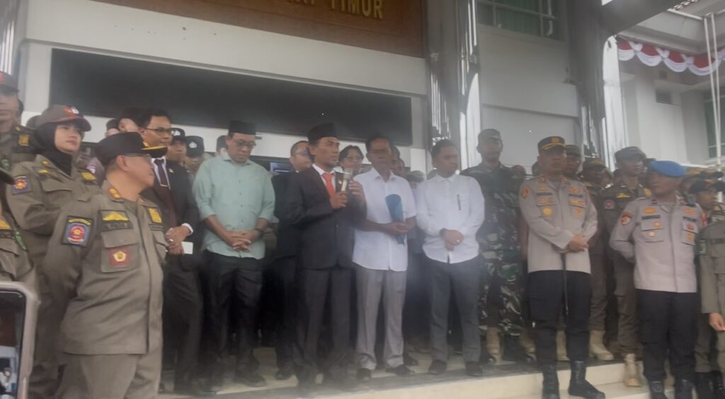 Di tengah berlangsungnya orasi, Ketua DPRD Kutai Timur Jimmi muncul dari dalam gedung didampingi sejumlah anggota dewan lintas fraksi dan komisi. Di hadapan massa, Jimmi menyampaikan apresiasi atas penyampaian aspirasi yang dilakukan secara tertib dan terbuka.