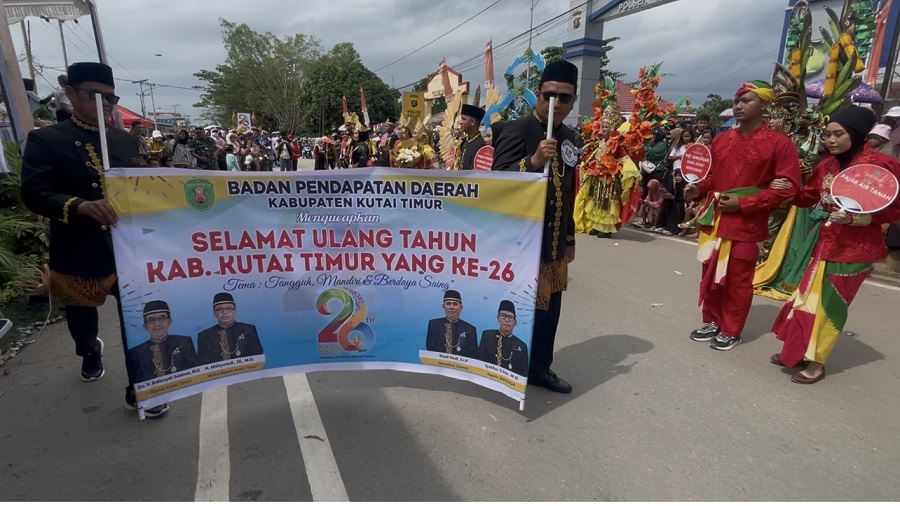 Ketua DPRD Kutai Timur Jimmi dan Bupati Ardiansyah Sulaiman tampak duduk di tribun utama, menyaksikan kirab dengan penuh antusias. Saat rombongan Badan Pendapatan Daerah (Bapenda) tiba di depan tribun, mereka menampilkan tarian pembuka sebelum dua peserta perempuan naik ke area depan tribun untuk menyerahkan cinderamata. Ketua DPRD dan Bupati menyambutnya dengan tangan terbuka disertai ucapan terima kasih dan apresiasi atas semangat seluruh peserta.