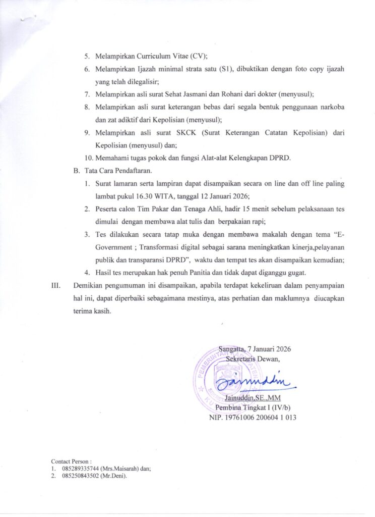 U M U MPendaftaran Seleksi Kelompok Pakar dan Tenaga Ahli DPRD Kabupaten Kutai Timur 2026 Admin07-01-202607-01-202601 mins Post navigation Previous: Selamat Jalan Alfian Aswad — Pejuang Rakyat, Tokoh Pembangunan Kutai TimurNext: Presiden Prabowo Resmikan RDMP Balikpapan, Perkuat Ketahanan Energi Nasional dan Infrastruktur Gas Negara Leave a Reply Cancel replyYour email address will not be published. Required fields are marked *Comment * Name * Email * Website Save my name, email, and website in this browser for the next time I comment.